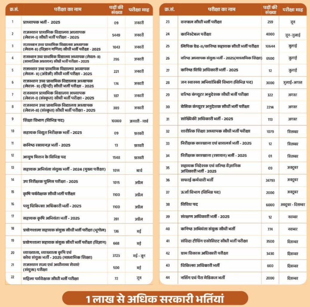 The Rajasthan Public Service Commission (RPSC), Rajasthan Staff Selection Board (RSSB - earlier known as RSMSSB), and other departments like education, police, agriculture, technical, and administrative services are going to recruit more than 1 lakh candidates across various departments. Check the table below for a brief overview of the exam calendar: