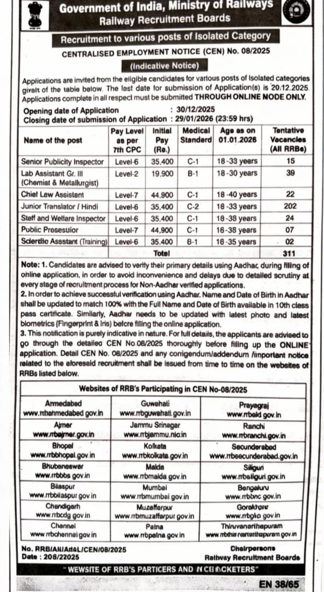 RRB Isolated Category Recruitment 2025 Vacancy |