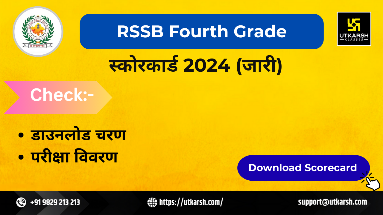 राजस्थान कर्मचारी चयन बोर्ड (आरएसएसबी) द्वारा 26 जनवरी 2026 को आरएसएसबी चतुर्थ श्रेणी परीक्षा का स्कोरकार्ड 2024 अपलोड कर दिया है। आरएसएसबी चतुर्थ श्रेणी कर्मचारी भर्ती परीक्षा 2024 का आयोजन 19 से 21 सितंबर 2025 तक किया गया था और परिणाम 16 जनवरी 2026 को घोषित किए गए थे। आरएसएसबी चतुर्थ श्रेणी स्कोरकार्ड 2024 में योग्य और अयोग्य दोनों उम्मीदवारों के अंक शामिल हैं। आरएसएसबी चतुर्थ श्रेणी परीक्षा 2024 में शामिल हुए उम्मीदवार आधिकारिक आरएसएसओ राजस्थान पोर्टल पर अपना परिणाम देख और डाउनलोड कर सकते हैं।