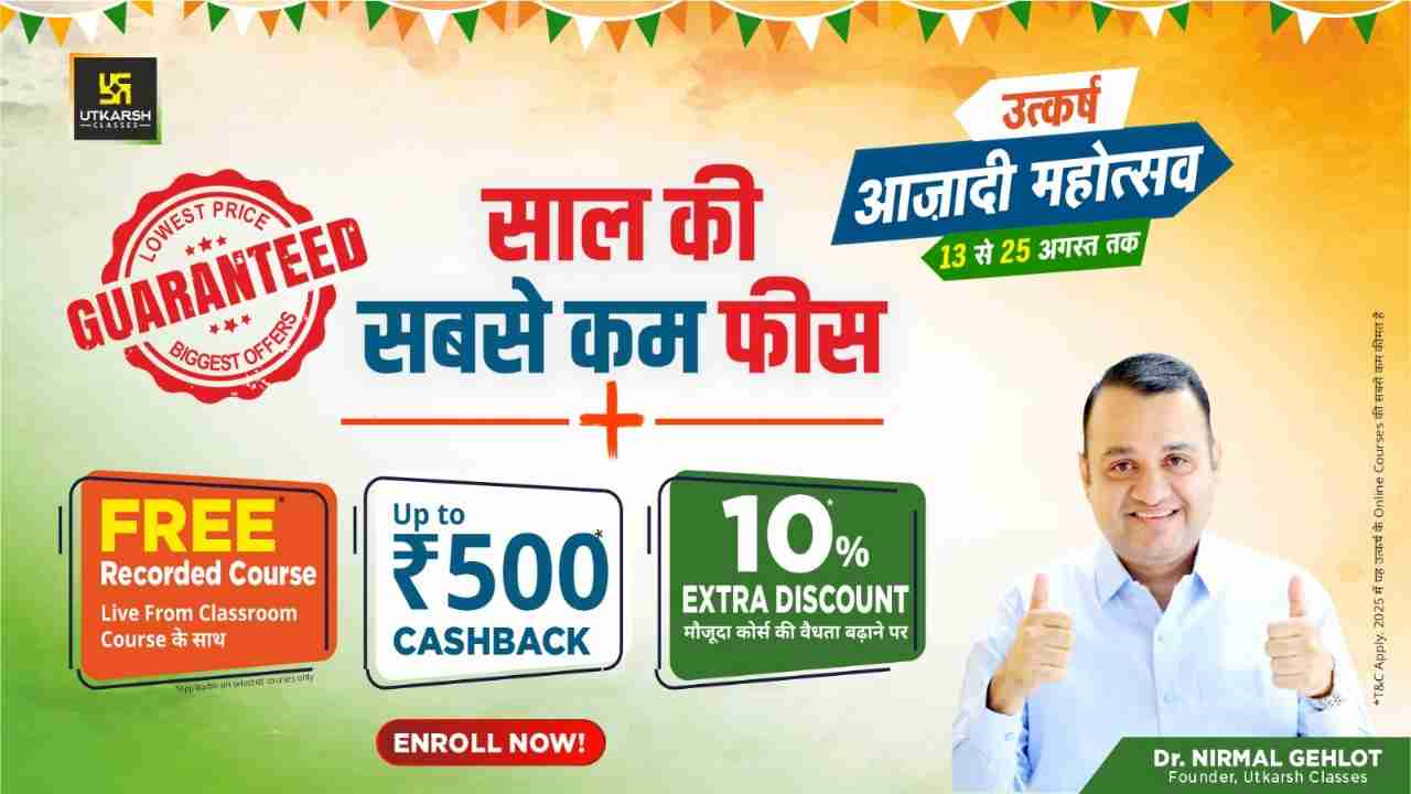 उत्कर्ष आज़ादी महोत्सव केवल एक सेल से ज्यादा है; यह हर छात्र तक ऑनलाइन कोर्स और मार्गदर्शन पहुंचाने का हमारा तरीका है। बेमिसाल छूट, मुफ्त रिकॉर्डेड कोर्स, कैशबैक इनाम, और किफायती अध्ययन सामग्री के साथ, यह आपकी तैयारी को अगले स्तर तक ले जाने का सही मौका है। ध्यान रखें कि यह ऑफर केवल 13 अगस्त से 25 अगस्त 2025 तक मान्य है। इंतजार न करें, आज ही नामांकन करें और साल के सबसे कम खर्च पर सरकारी प्रतियोगी परीक्षा में सफलता पाने का अपना सपना सच करें।