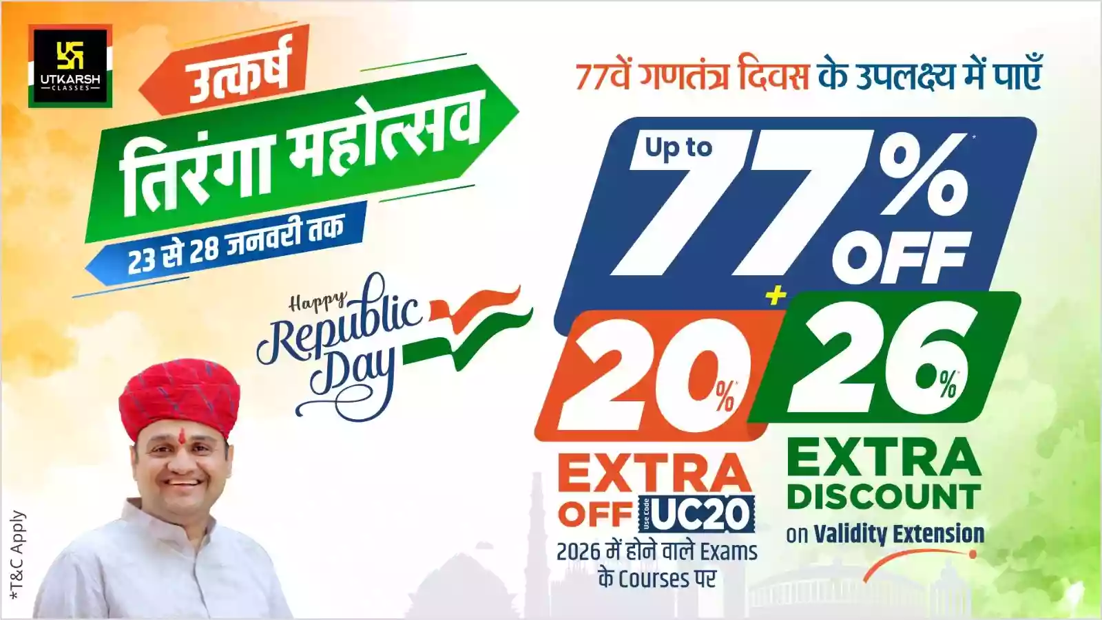 भारत 2026 में अपना 77वां गणतंत्र दिवस मना रहा है, और यह संविधान अपनाने के बाद से राष्ट्र की स्वतंत्रता, लोकतंत्र और प्रगति की अविश्वसनीय यात्रा पर विचार करने का एक महत्वपूर्ण क्षण है। यह ऐतिहासिक उपलब्धि उन राष्ट्रीय नेताओं के बलिदानों को नमन करती है जिन्होंने लोकतांत्रिक मूल्यों पर आधारित भारत की कल्पना की थी। उत्कर्ष क्लासेज में, हम मानते हैं कि गणतंत्र दिवस का उत्सव हमारे छात्रों के भविष्य पर ध्यान केंद्रित किए बिना अधूरा है। सरकारी परीक्षाओं की तैयारी पर 77% तक की विशेष छूट के साथ हमारे ऑनलाइन कोर्सेज में दाखिला लेकर इस विशेष अवसर का जश्न मनाने में हमारे साथ शामिल हों।