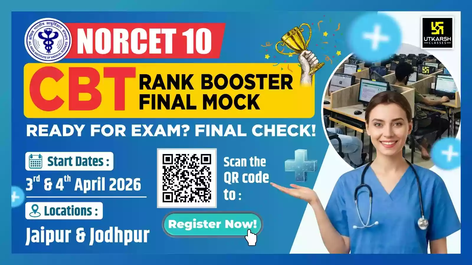 उम्मीदवार अब एम्स नॉरसेट 10 के लिए वास्तविक परीक्षा आधारित मॉक का प्रयास कर सकते हैं और सीबीटी जैसे वातावरण में अपनी परफॉर्मेंस का मूल्यांकन कर सकते हैं। उम्मीदवार इस वास्तविक परीक्षा आधारित मॉक को उत्कर्ष क्लासेज के जयपुर और जोधपुर के ऑफलाइन केंद्रों पर, सीबीटी सेटअप में दे सकते हैं। परीक्षा से केवल 7 दिन पहले निर्धारित यह मॉक टेस्ट, नर्सिंग उम्मीदवारों को वास्तविक परीक्षा के दबाव का अनुभव करने और अपनी परफॉर्मेंस सुधारने का अवसर देता है। उम्मीदवारों को अंतिम तिथि से पहले पंजीकरण करने की सलाह दी जाती है, क्योंकि पंजीकरण अनिवार्य है और अंतिम तिथि के बाद प्रवेश की अनुमति नहीं दी जाएगी।