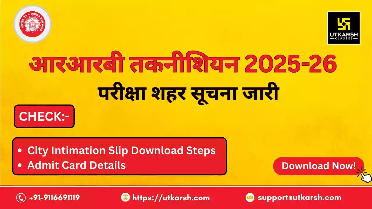 रेलवे भर्ती बोर्ड (आरआरबी) द्वारा, आरआरबी तकनीशियन भर्ती 2025 के कंप्यूटर आधारित परीक्षा (सीबीटी) के लिए आरआरबी तकनीशियन शहर सूचना पर्ची 2026 सभी जोनल वेबसाइट पर 26 फरवरी 2026 को जारी कर दी गयी है। आरआरबी कंप्यूटर आधारित परीक्षा 6, 9, 10 और 13 मार्च 2026 को कई पालियों में आयोजित की जाएगी, और 6 मार्च 2026 को निर्धारित परीक्षा के लिए शहर सूचना पर्ची का लिंक सक्रिय कर दिया गया है। परीक्षा शहर सूचना पर्ची से छात्रों को उनकी सटीक परीक्षा तिथि और परीक्षा शहर की जानकारी मिलती है, जिससे उन्हें अपनी यात्रा की व्यवस्था पहले से करने में मदद मिलती है। आरआरबी तकनीशियन परीक्षा शहर सूचना पर्ची और रेलवे तकनीशियन सीबीटी प्रवेश पत्र 2026 के बारे में अपडेट प्राप्त करने के लिए इस पेज को नीचे स्क्रॉल करें।